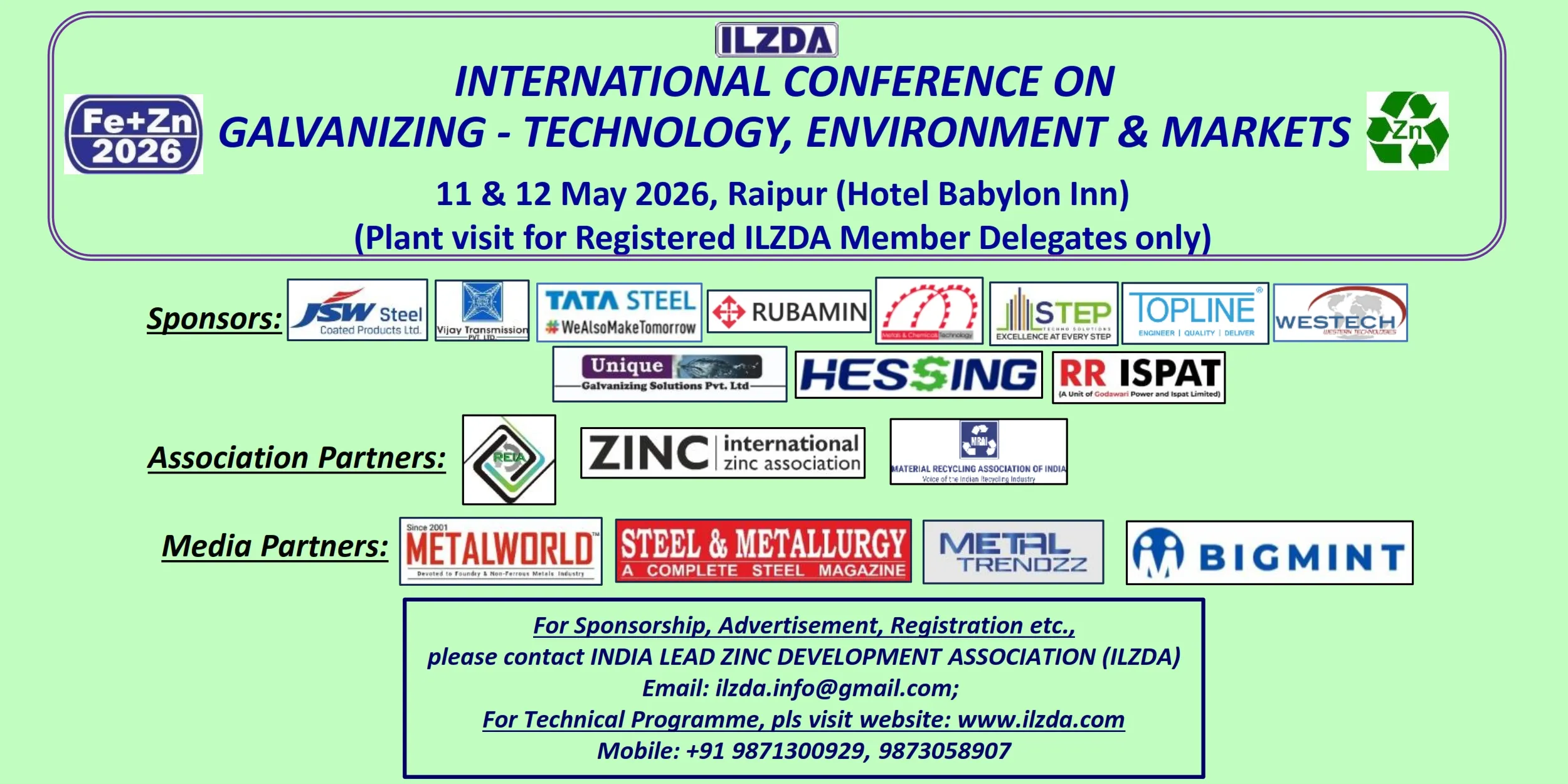 The Raipur conference will focus on the latest developments in Galvanizing in respect of process technology, current & emerging markets, plant & equipment, quality assurance, waste minimization, sustainable development and environment protection. The conference will focus on all types of galvanizing: steel sheet, general, tube and wire.