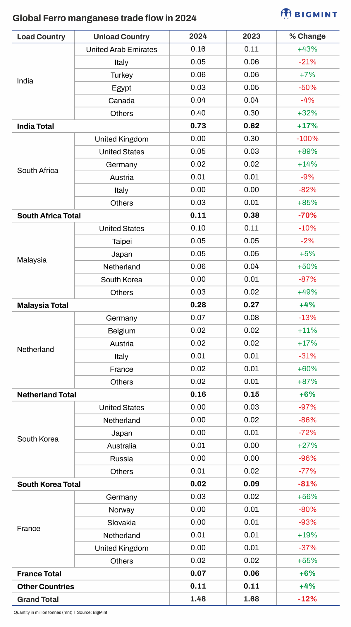 Morning Brief: Global manganese alloys exports dropped by 5.5% y-o-y in CY'24, according to latest data available with BigMint. Total trade in manganese alloys dropped to 4.15 million tonnes (mnt) in CY'24 from 4.39 mnt in the year prior.