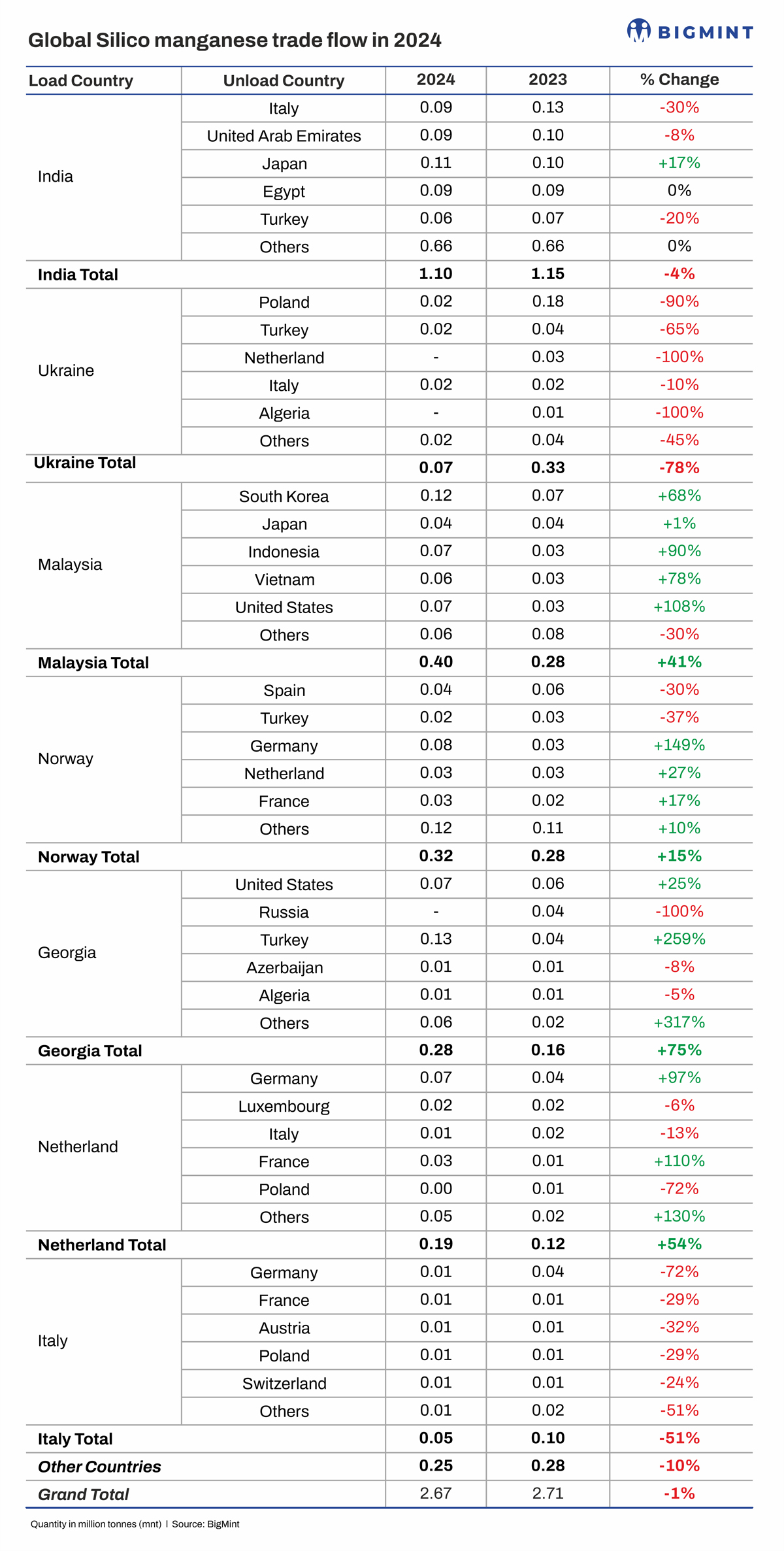 Malaysian smelters post record production growth:Malaysiaraised its production and exports of manganese alloys significantly in CY'24. The South Asian country increased its exports of silico manganese by over 40% y-o-y.
