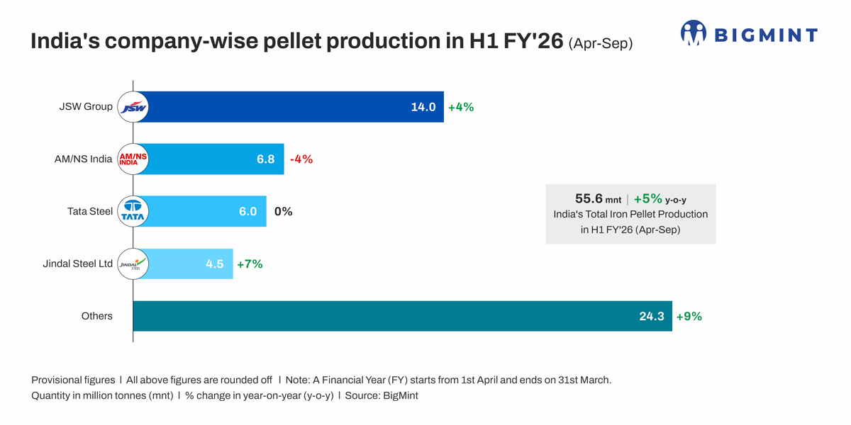 Morning Brief: Production of iron ore pellets in India in the April-September period of the current fiscal (H1FY'26) stood at around 55.6 million tonnes (mnt), as per provisional data with BigMint. India's pellet production rose by over 5% y-o-y from around 53 mnt in H1FY'25.