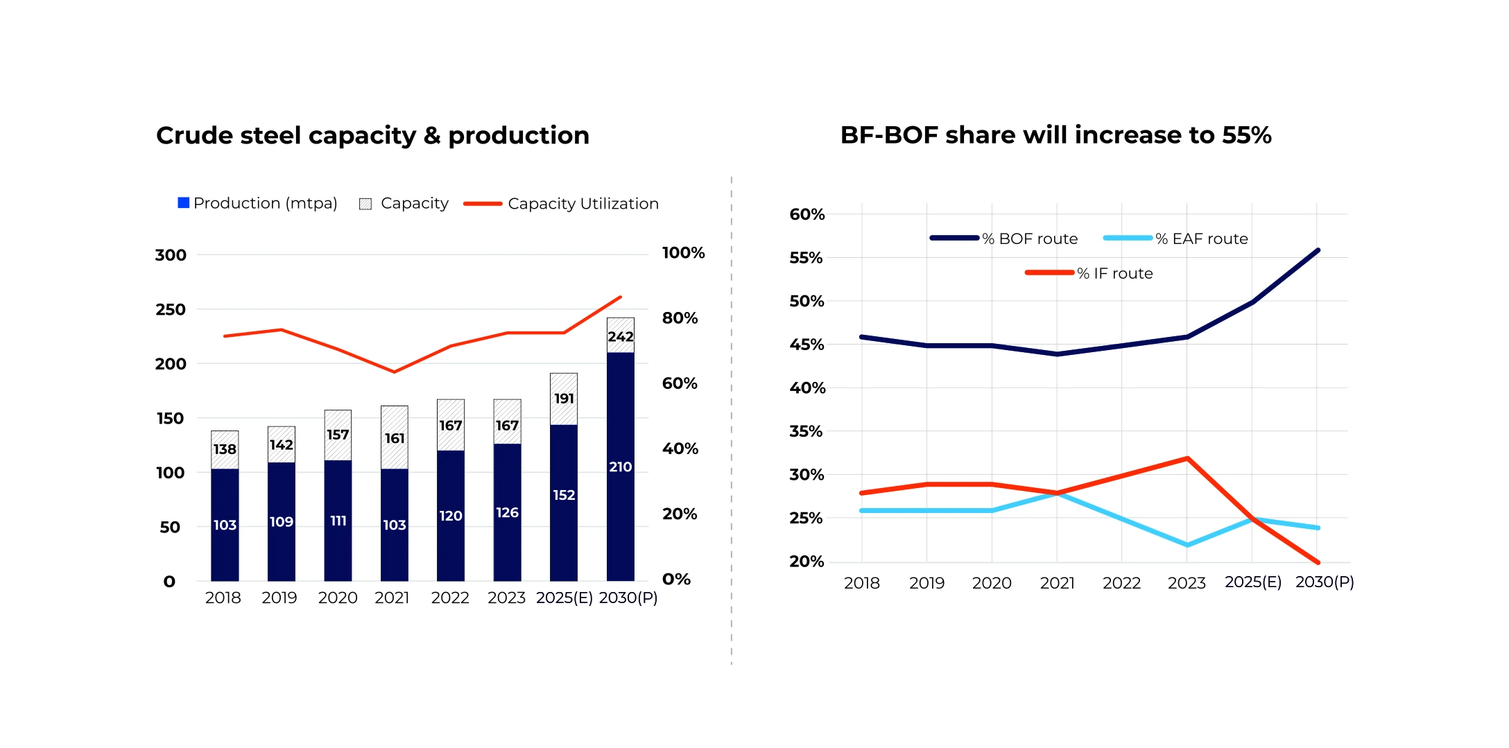 Bigmint predicts that steel production will reach 210 million tonnes by 2030, assuming a 7-8% compound annual growth rate(CAGR).Bigmint also projects that by 2030, the Basic Oxygen Furnace(BOF) steelmaking route will increase to contribute 55 % , while the sum of Electric Arc Furnace(EAF) & induction route will remain at 45 % .