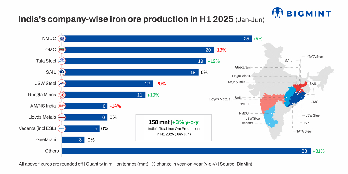Morning Brief: Indias iron ore production increased by a slight 3% to 158 million tonnes (mnt) in H1CY'25 compared to 153 mnt in H1CY'24, according to provisional data maintained with BigMint.