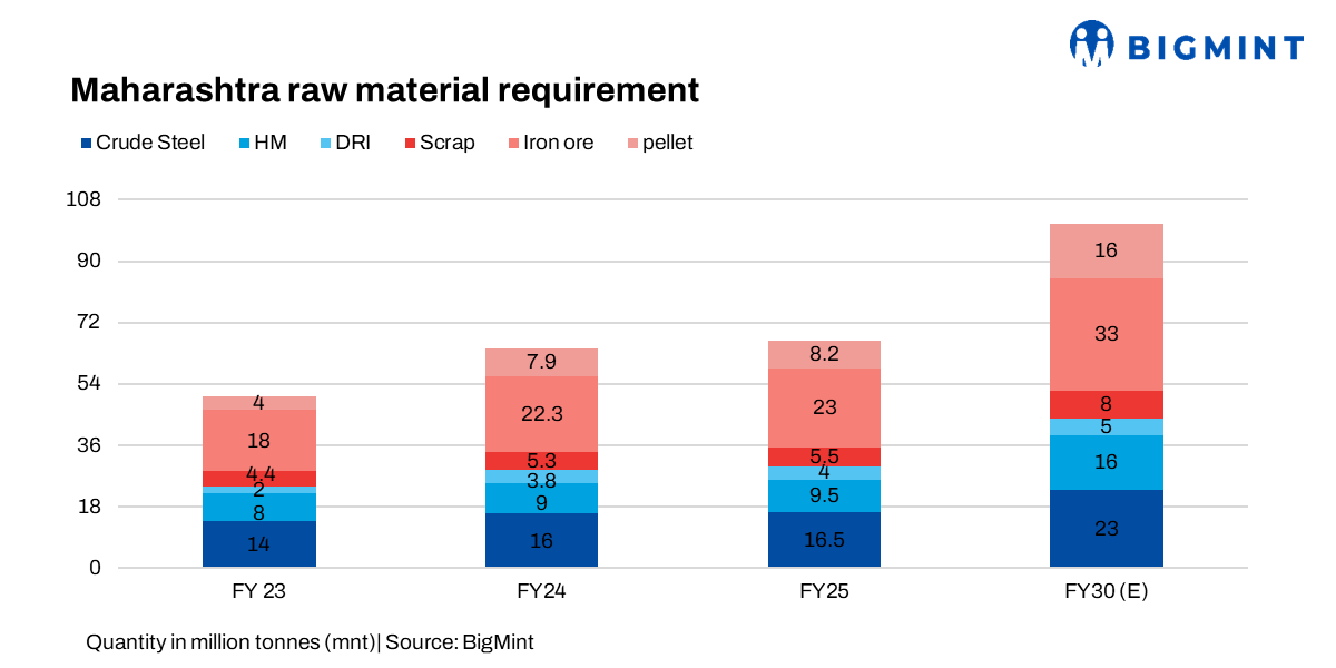 In FY'25, Maharashtra consumed 23 mnt of iron ore, 6.5 mnt of coking coal, and 3.5 mnt of non-coking coal to meet its steel production needs. Additionally, it utilised 3.5 mnt of sponge iron, 5 mnt of scrap, and 0.12 mnt of pig iron, reflecting a well-diversified raw material mix supporting both primary and secondary steelmaking routes.