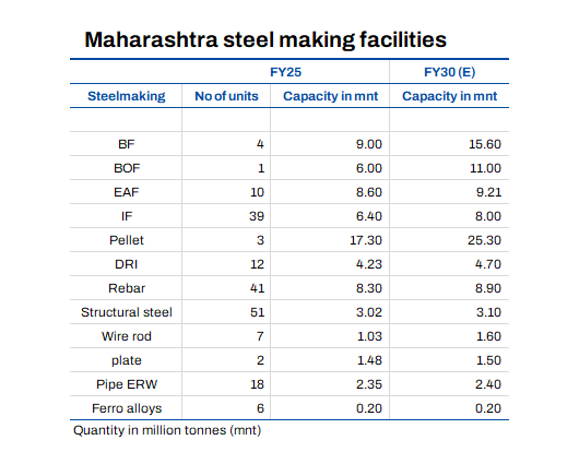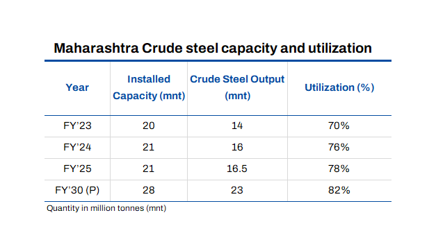 Among the states leading this progress, Maharashtra deserves special mention as a rising steelmaking powerhouse.Notably, Maharashtra ranks as the fourth-largest crude steel producer in the country. In FY'25, it generated 16.5 million tonnes (mnt) of crude steel from an installed capacity of 21 mnt. With expansion plans underway, this capacity is expected to grow33% to 28 mnt by FY'30.