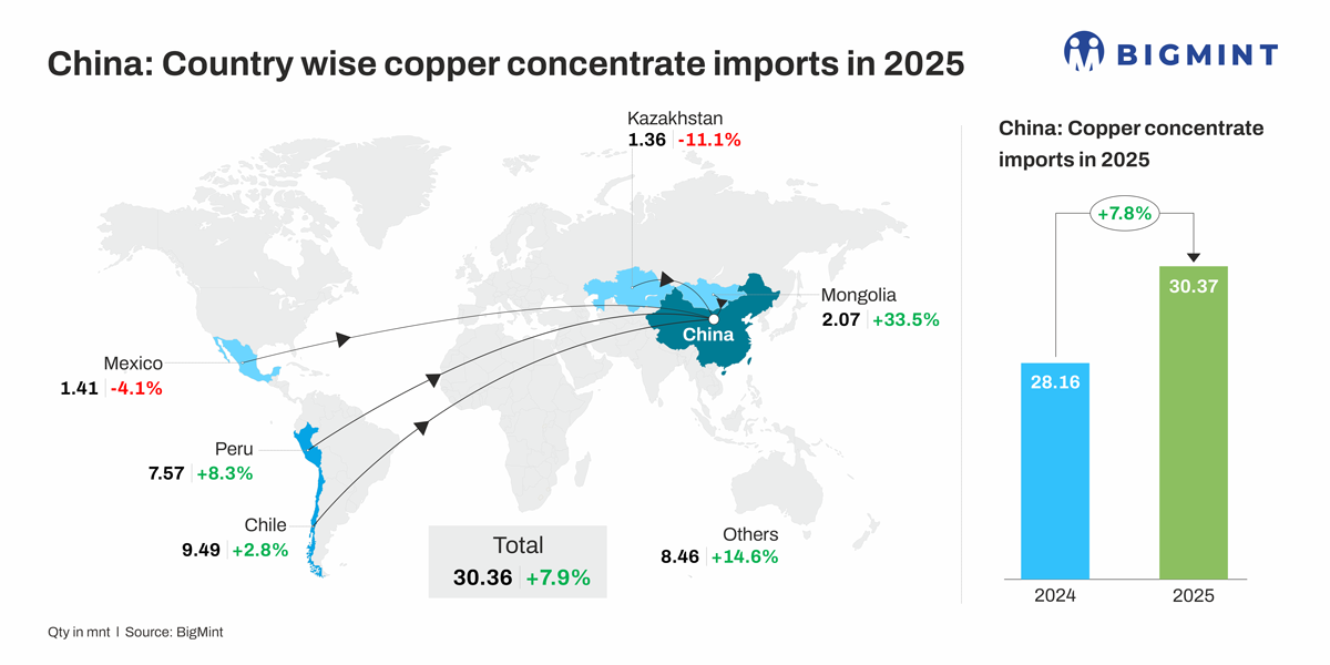 China's copper concentrate imports increased from 28.16 mnt in 2024 to 30.37 mnt in 2025, reflecting a growth of ~8% y-o-y.