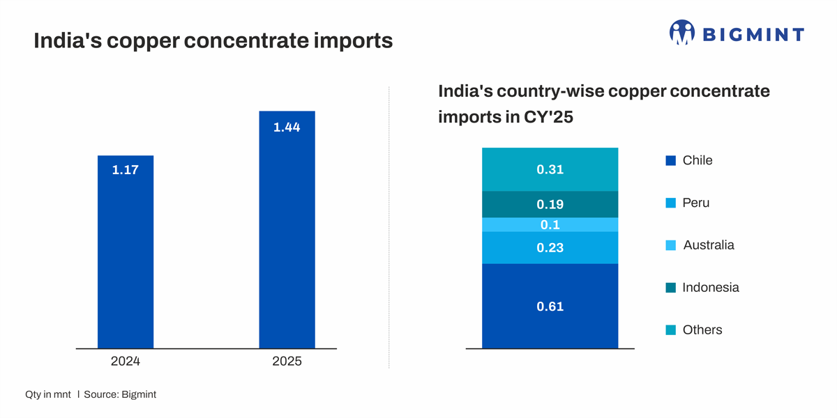 India's copper concentrate imports rose to 1.44 mnt in CY'25, compared to 1.17 mnt in CY'24, reflecting an approximate 23% y-o-y increase. This trend highlights the structural imbalance in the domestic copper ecosystem, where production growth has not kept pace with rising demand.