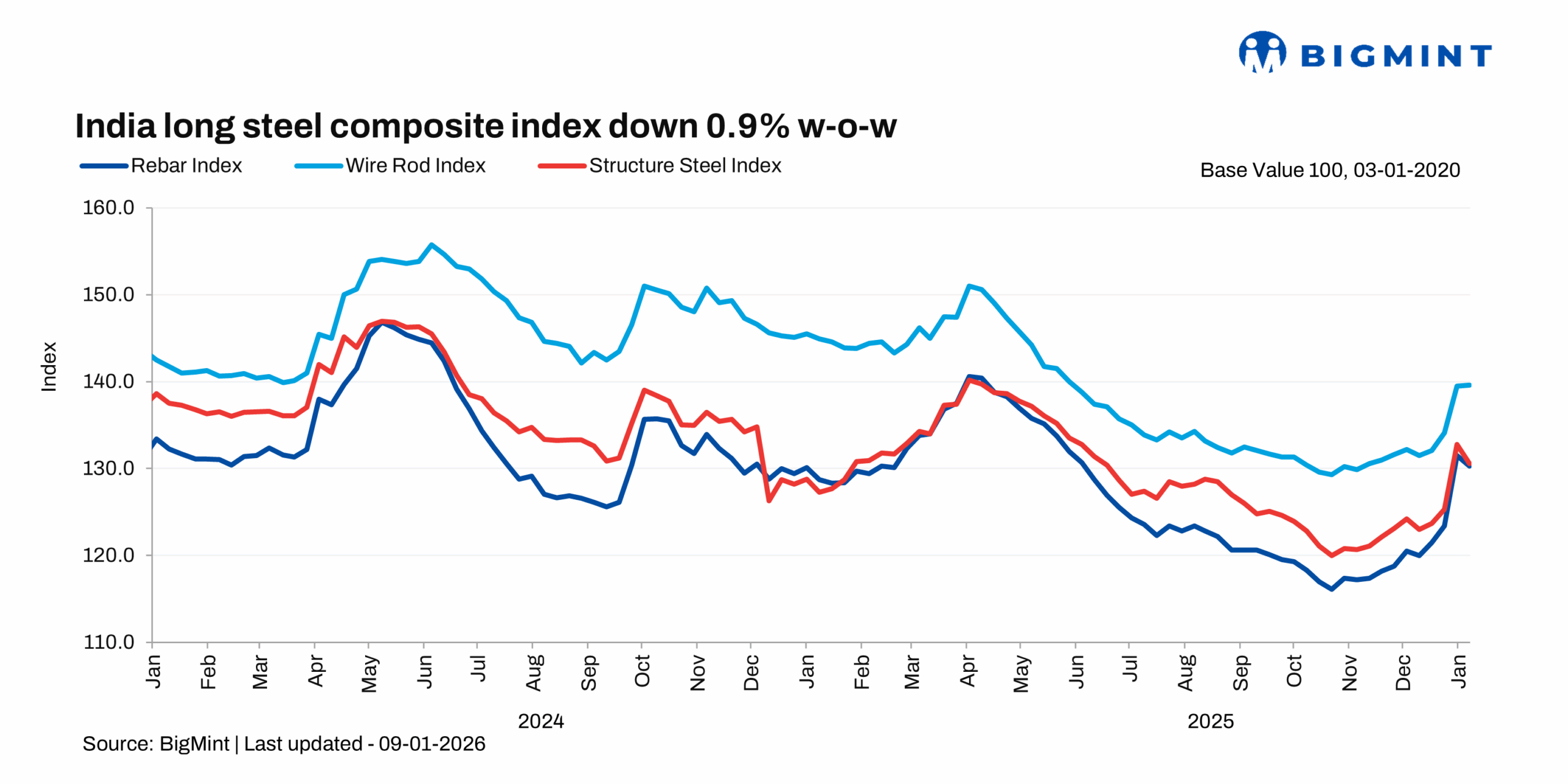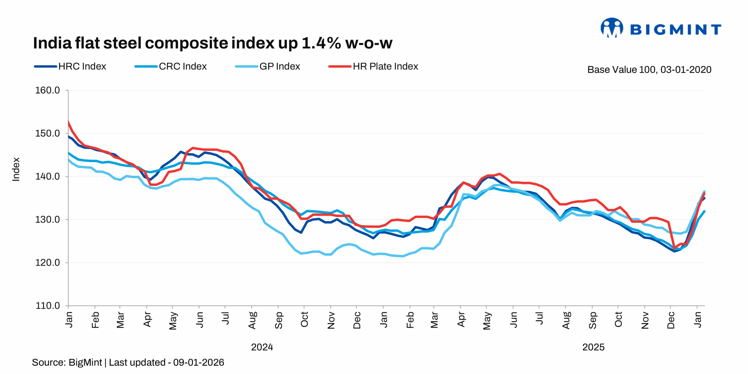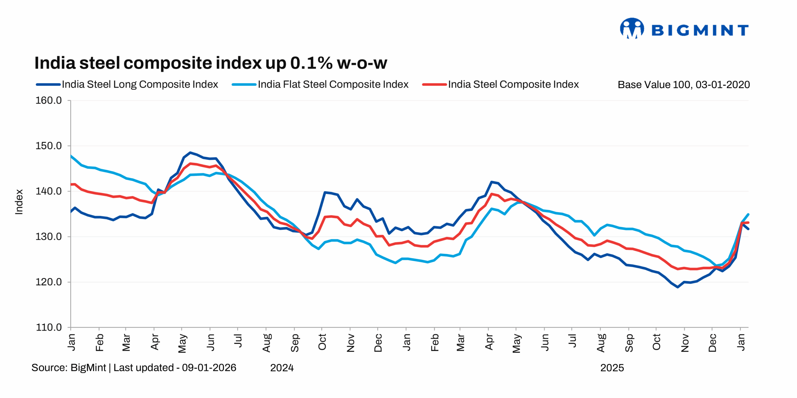 Morning Brief: BigMint's flagship India steel composite index, a barometer of the domestic steel market, remained in positive territory in the week ending 9 January 2026, although the market euphoria of the previous week died down, with the sudden price surge moderating significantly. The previous week had seen the index surging by over 4% w-o-w, the highest on a weekly basis in close to four years.