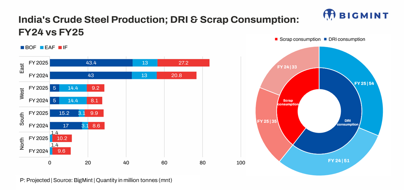 As per BigMint data, India's production and consumption of sponge iron has recorded a sharp growth in recent years. Production has climbed to around 55 mnt, while consumption increased by 6% y-o-y in FY'25 to 54 mnt. The country's iron ore production reached nearly 290 mnt in the last fiscal, while pellet output surged to 105 mnt.