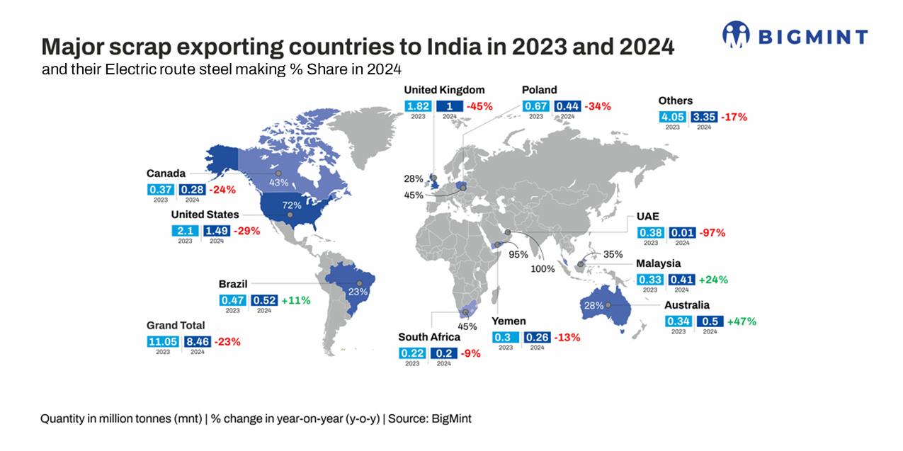 Steel market volatility spilled over into raw material markets and affected consumption. India, with consumption of over 34 mnt of scrap in CY'24, was the fourth largest consumer globally after China (more than 220 mnt), EU (73 mnt), and the US (55.6 mnt).