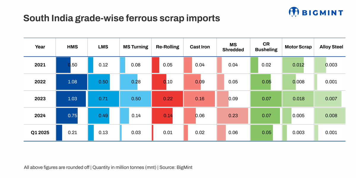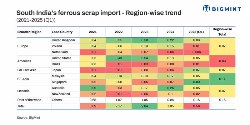 Specifically, south India's scrap imports showed an overall uptrend from 0.89 mnt registered in 2021 -- 2.17 mnt in 2022 and 2.84 mnt in 2023 -- while volumes fell 35% y-o-y to 1.85 mnt in 2024. Meanwhile, imports totalled 0.56 mnt in Q1CY'25.