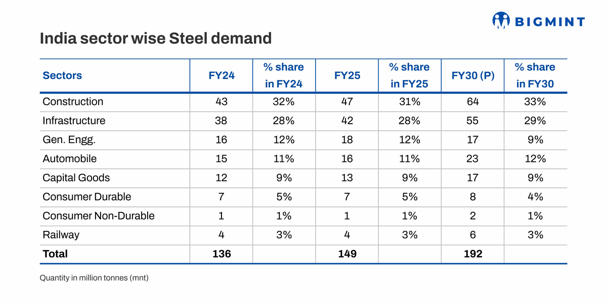 According to the latest figures, Indias steel demand reached 149 mnt in FY25, up from 136 mnt in FY24. The construction sector alone consumed 47 mnt (31%), while the infrastructure segment accounted for 42 mnt (28%). By FY30, the construction sectors share is projected to rise to 64 mnt (33%), and infrastructure to 55 mnt (29%), reflecting the substantial pipeline of housing, roadways, railways, metros, and logistics projects.