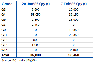 On 29 January, G4 dominated volumes at 53,050 t, largely from Sonepur Bazari at 25,000 t at INR 4,651/t and Khottadih at 12,150 t at INR 4,553/t. G3 cleared 6,500 t at INR 8,123/t from Jambad, while smaller quantities of G5 and G6 were allocated at INR 4,084/t and INR 3,024/t respectively.
