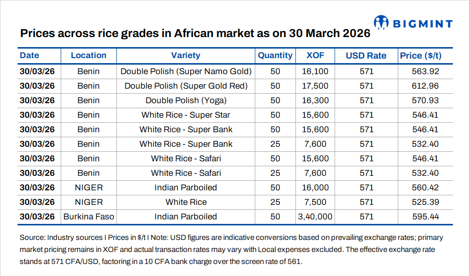 Benin's double polished rice market opened firm on 23 March at $572.68/tonne (t) and surged sharply to $588.13/t on 24 March, reflecting short-term tightness in high-grade supply and active buying. The rally, however, proved unsustainable. Prices corrected steadily over the following sessions, easing to $577.74 on 25 March and further to $574.69 by 27-28 March. The trajectory suggests that the initial spike was driven more by temporary demand pressure than structural supply constraints, with the market quickly finding equilibrium as arrivals improved.