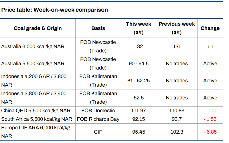The most significant development was the stabilisation of Australian 6,000 kilocalorie (kcal) per kilogram coal. Just one week earlier, a cargo for May loading had traded as low as $131/t on a free-on-board (FOB) basis, causing alarm among sellers. In the week to 17 April, the market regained its footing. A trade for June loading was reported at $132 per tonne, with most bids clustering in the $131.50-132 range.