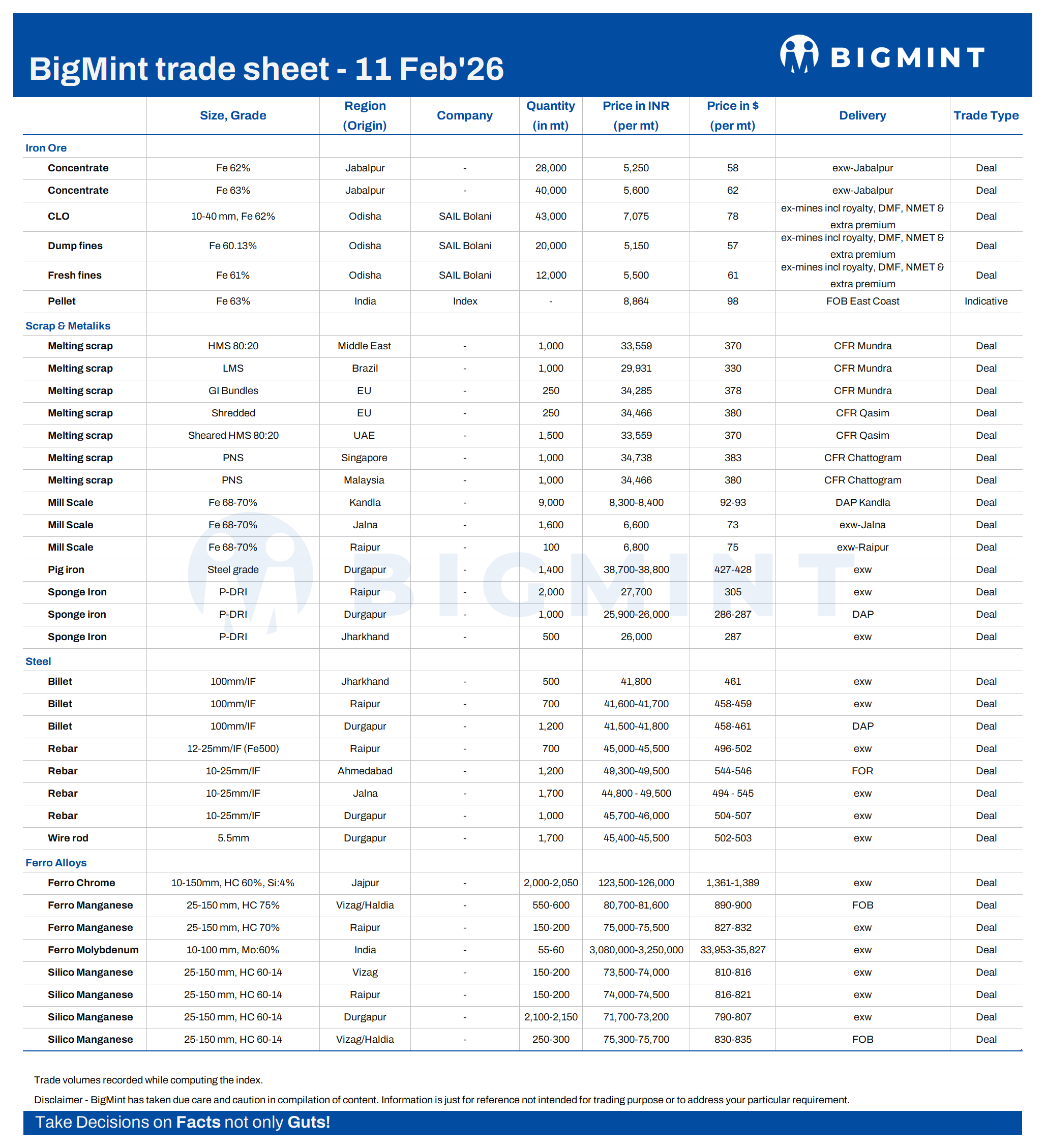 The following sheet summarises confirmed trades /offers of iron and steel products collected by BigMint to help our users keep track of day-to-day trade dynamics.