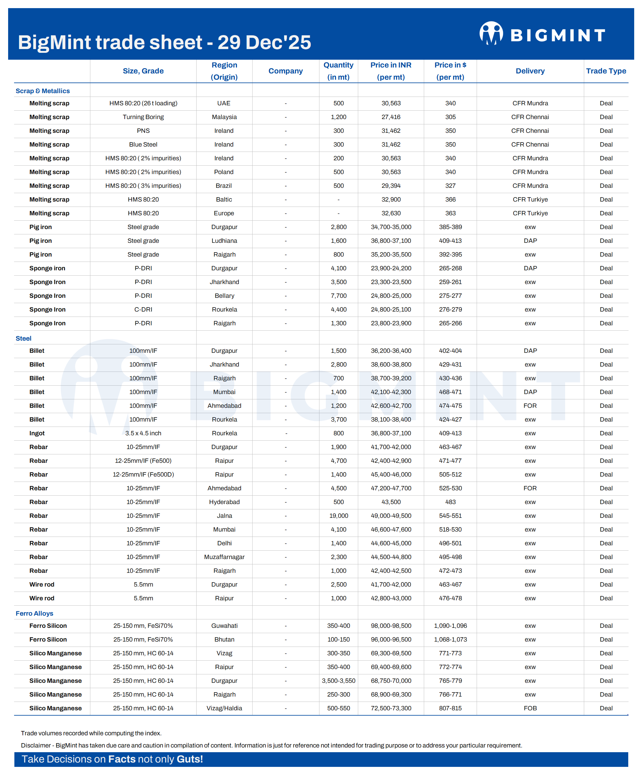 BigMint's daily trade sheet - 29 Dec'25