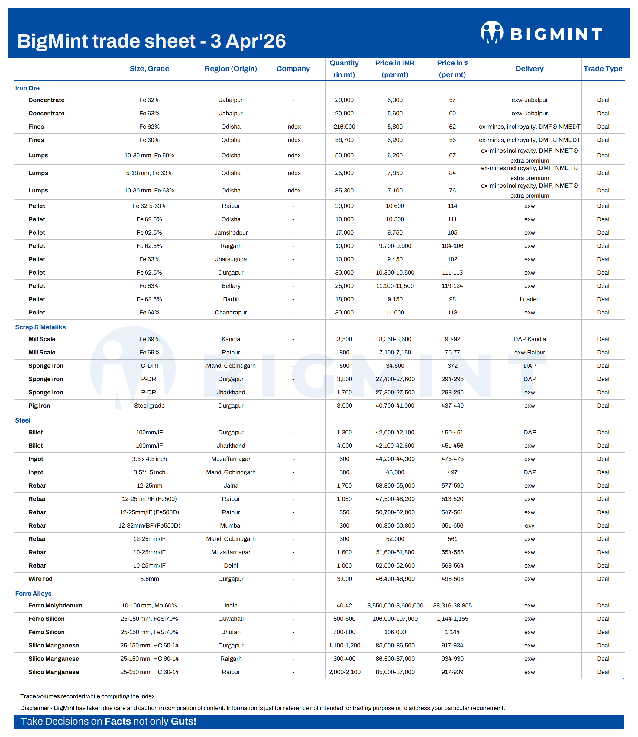 The following sheet summarises confirmed trades /offers of iron and steel products collected by BigMint to help our users keep track of day-to-day trade dynamics.