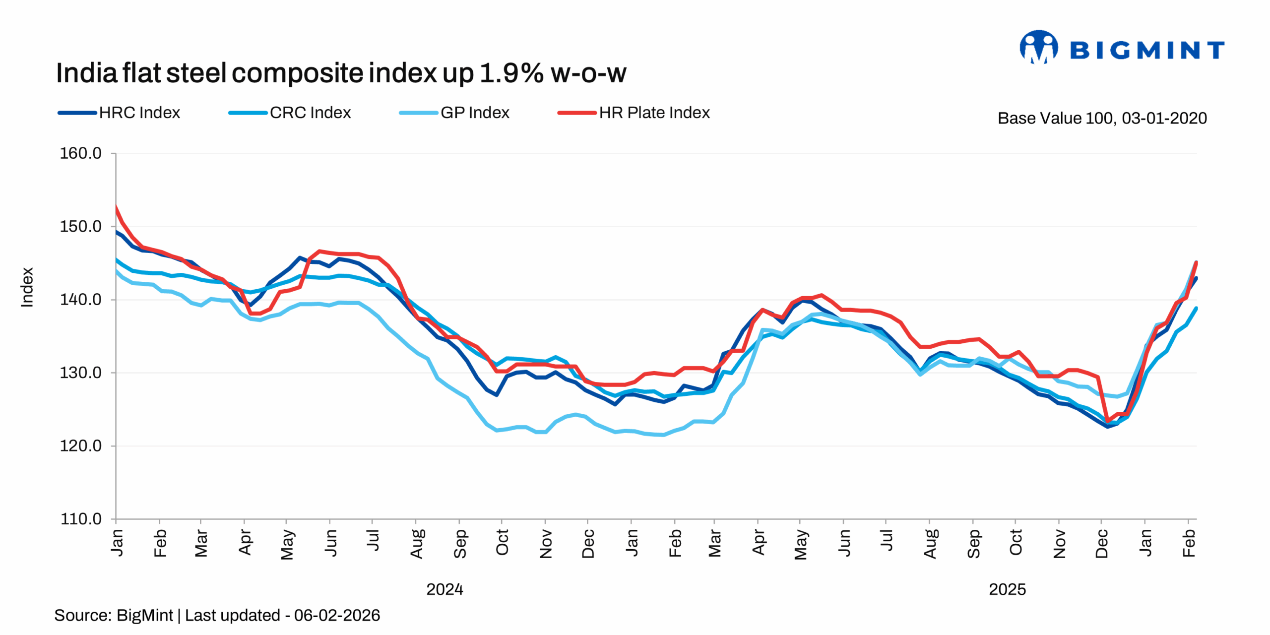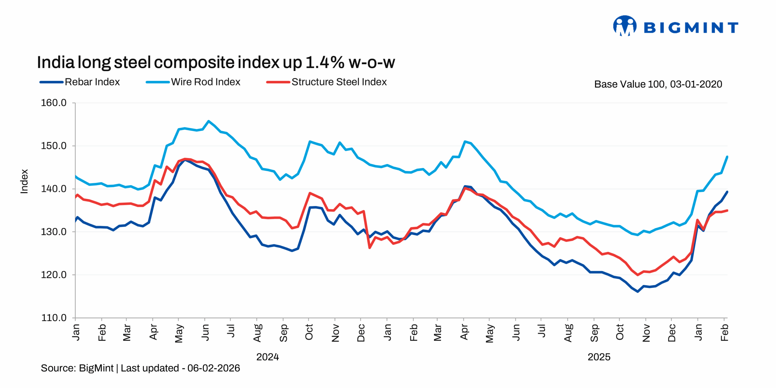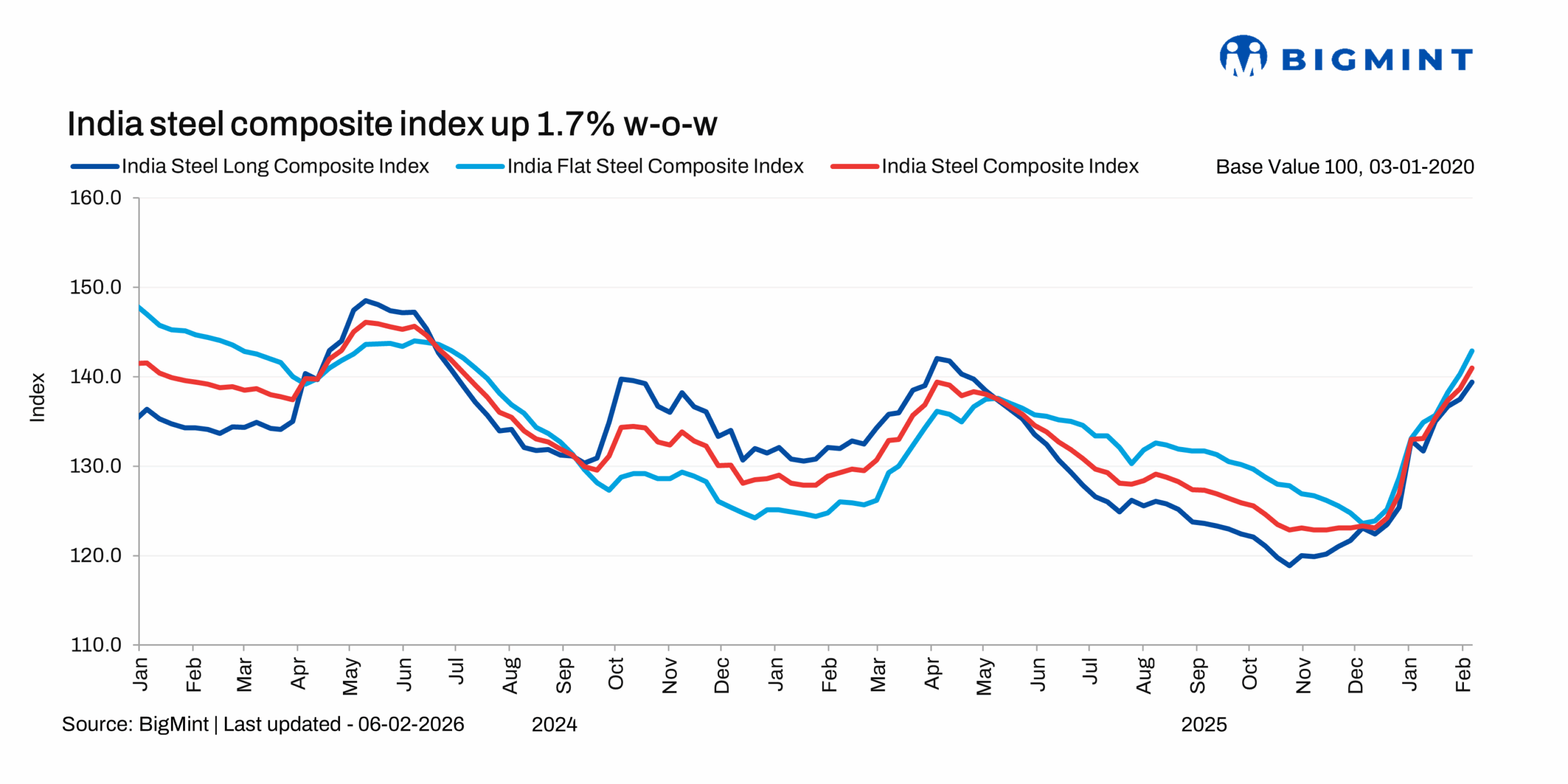 Morning Brief: The India steel composite index, BigMint's flagship offering which is a barometer of the domestic steel market, witnessed a spike in the week ending 6 February 2026, rising by 1.7% w-o-w as steel prices improved across segments on mill price hikes and positive sentiment. The uptrend in steel prices has been sustained throughout January and a strong demand outlook in Q4 is positive for the market.