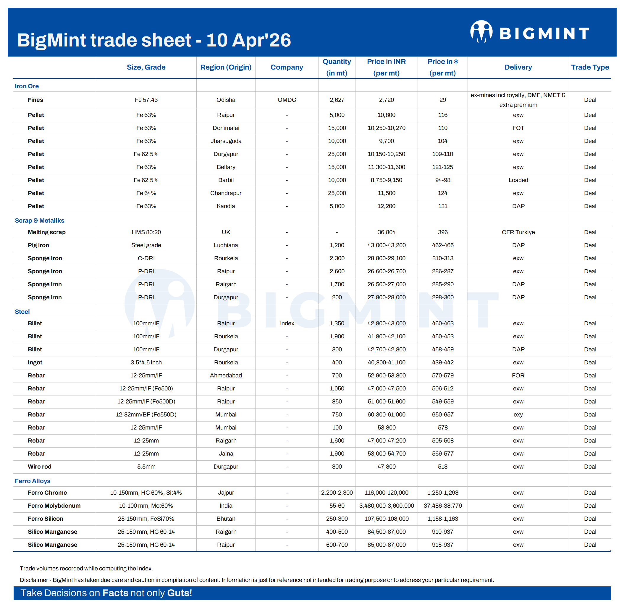The following sheet summarises confirmed trades /offers of iron and steel products collected by BigMint to help our users keep track of day-to-day trade dynamics.