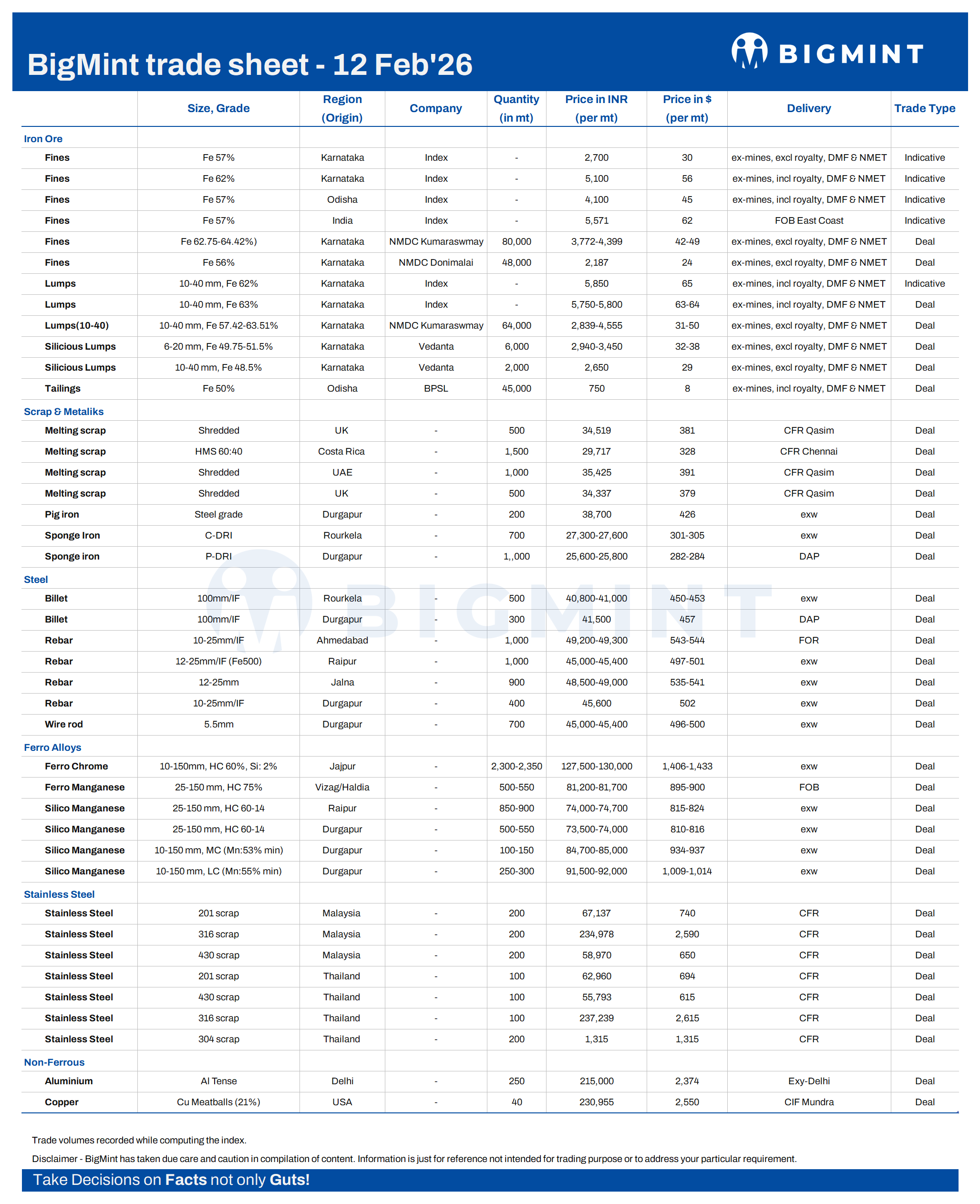 BigMint's daily trade sheet - 12 Feb'26