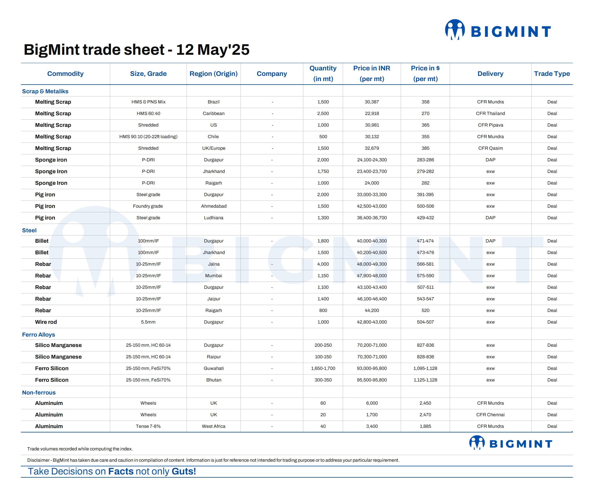 The following sheet summarises confirmed trades /offers of iron and steel products collected by BigMint to help our users keep track of day-to-day trade dynamics.