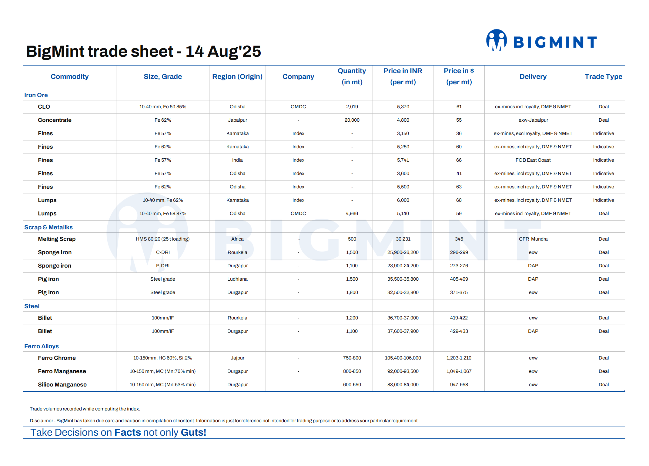 The following sheet summarises confirmed trades /offers of iron and steel products collected by BigMint to help our users keep track of day-to-day trade dynamics.