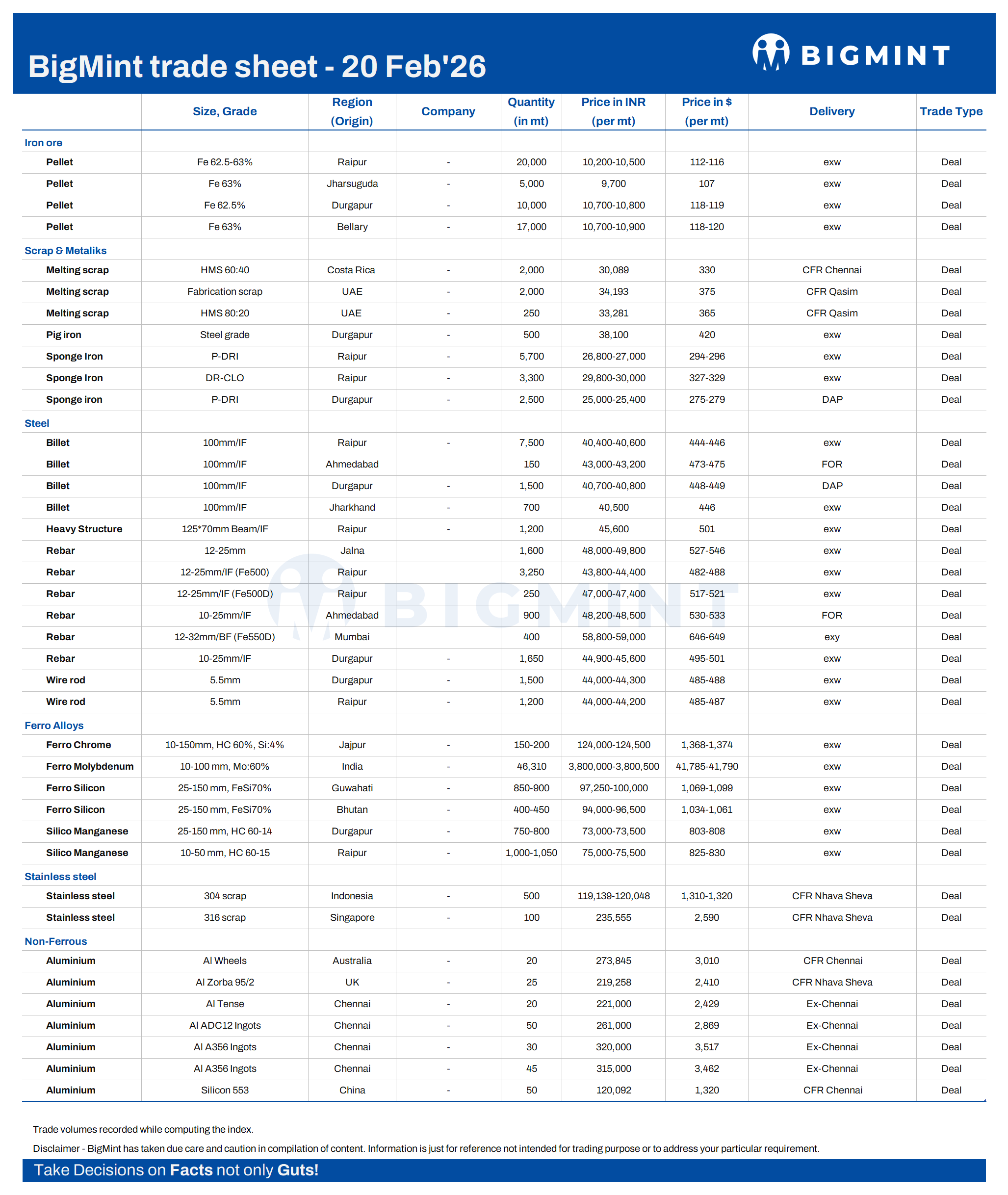 The following sheet summarises confirmed trades /offers of iron and steel products collected by BigMint to help our users keep track of day-to-day trade dynamics.