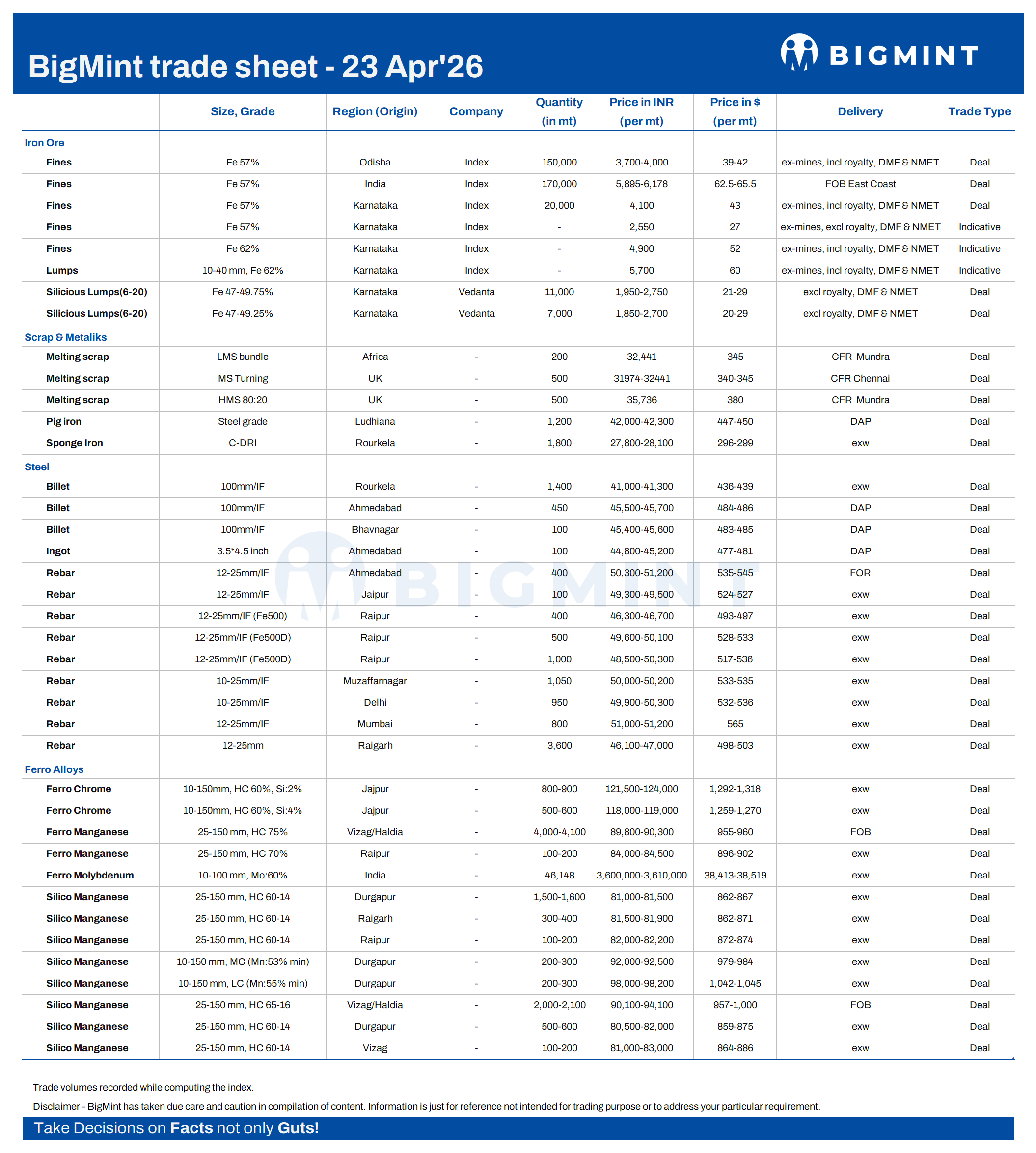 The following sheet summarises confirmed trades /offers of iron and steel products collected by BigMint to help our users keep track of day-to-day trade dynamics.