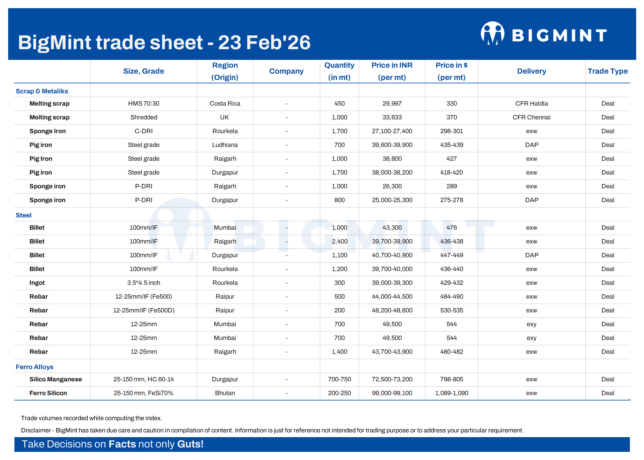 The following sheet summarises confirmed trades /offers of iron and steel products collected by BigMint to help our users keep track of day-to-day trade dynamics.