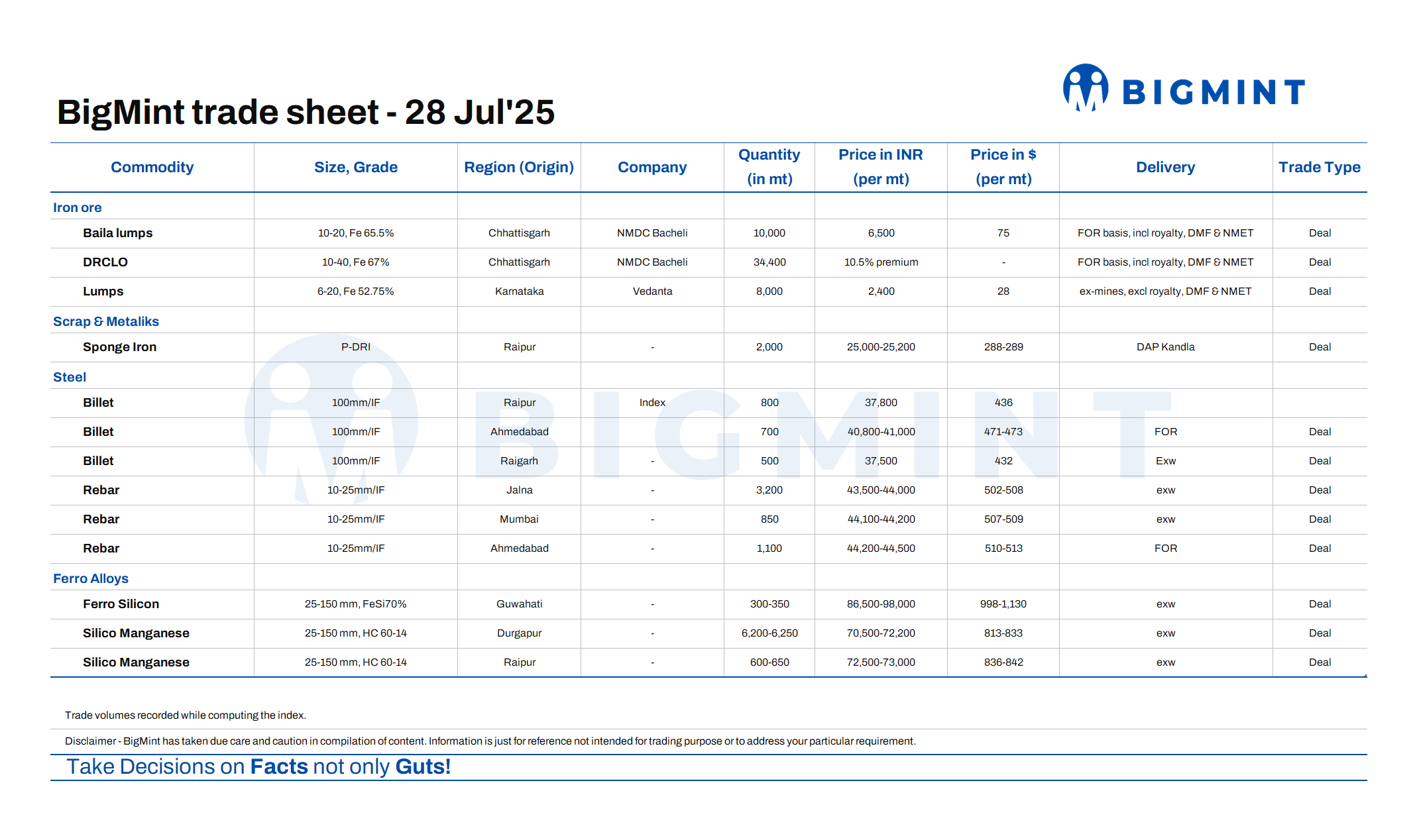 The following sheet summarises confirmed trades /offers of iron and steel products collected by BigMint to help our users keep track of day-to-day trade dynamics.