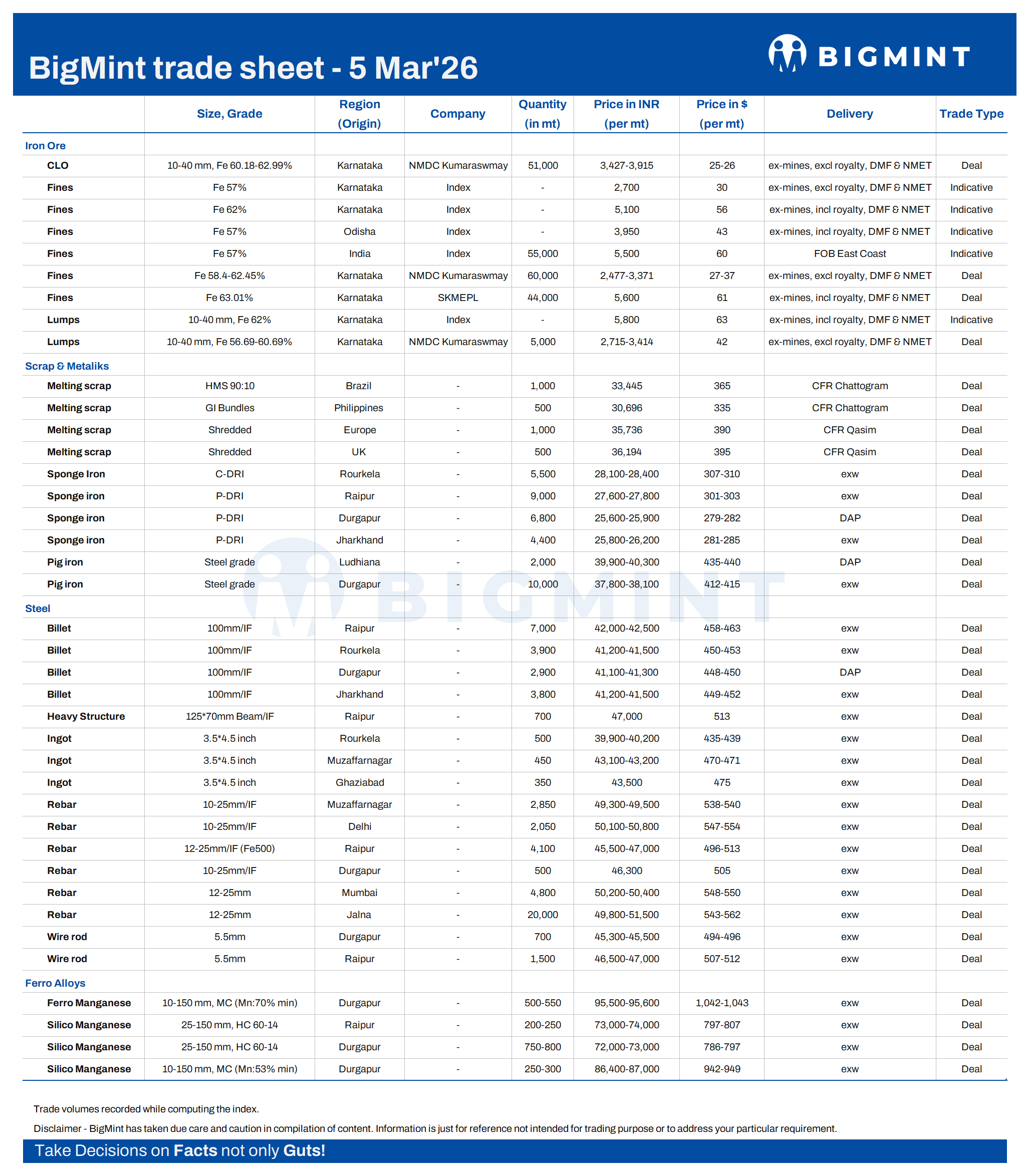 The following sheet summarises confirmed trades /offers of iron and steel products collected by BigMint to help our users keep track of day-to-day trade dynamics.