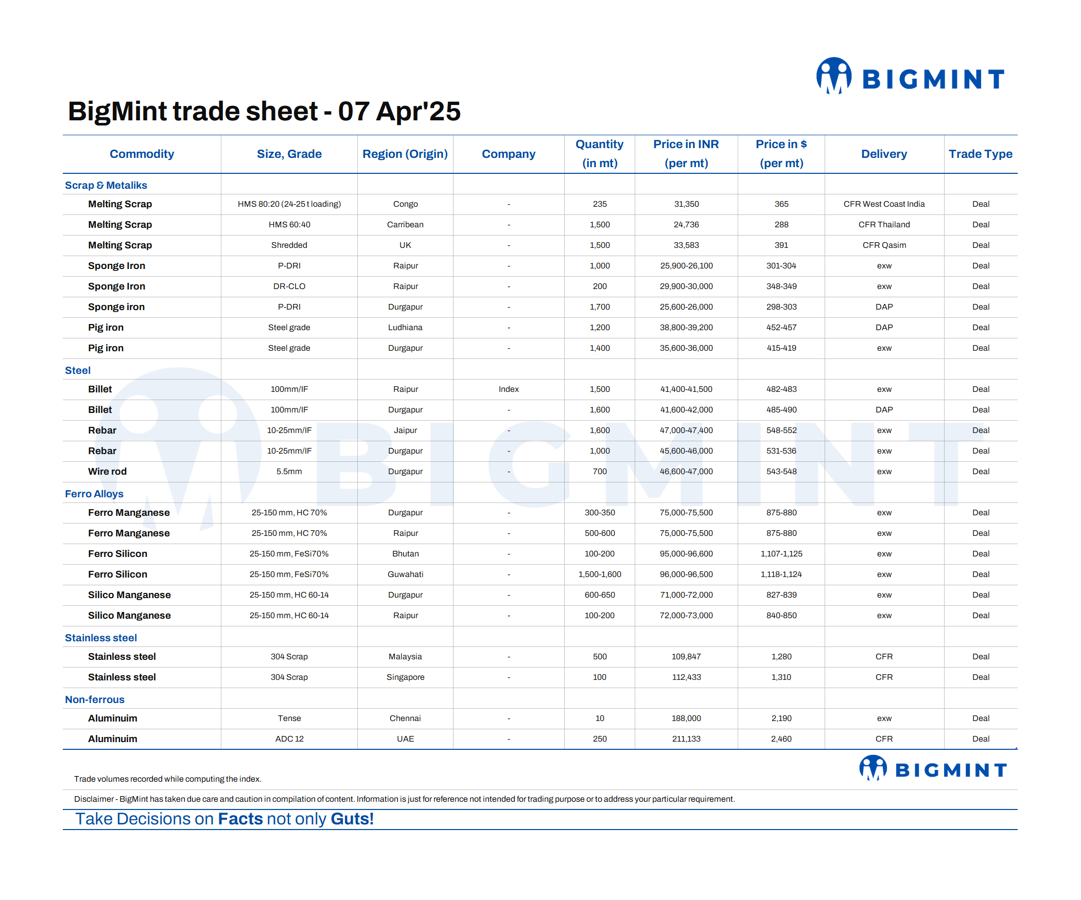 The following sheet summarises confirmed trades/offers of iron and steel products collected by BigMint to help our users keep track of day-to-day trade dynamics.