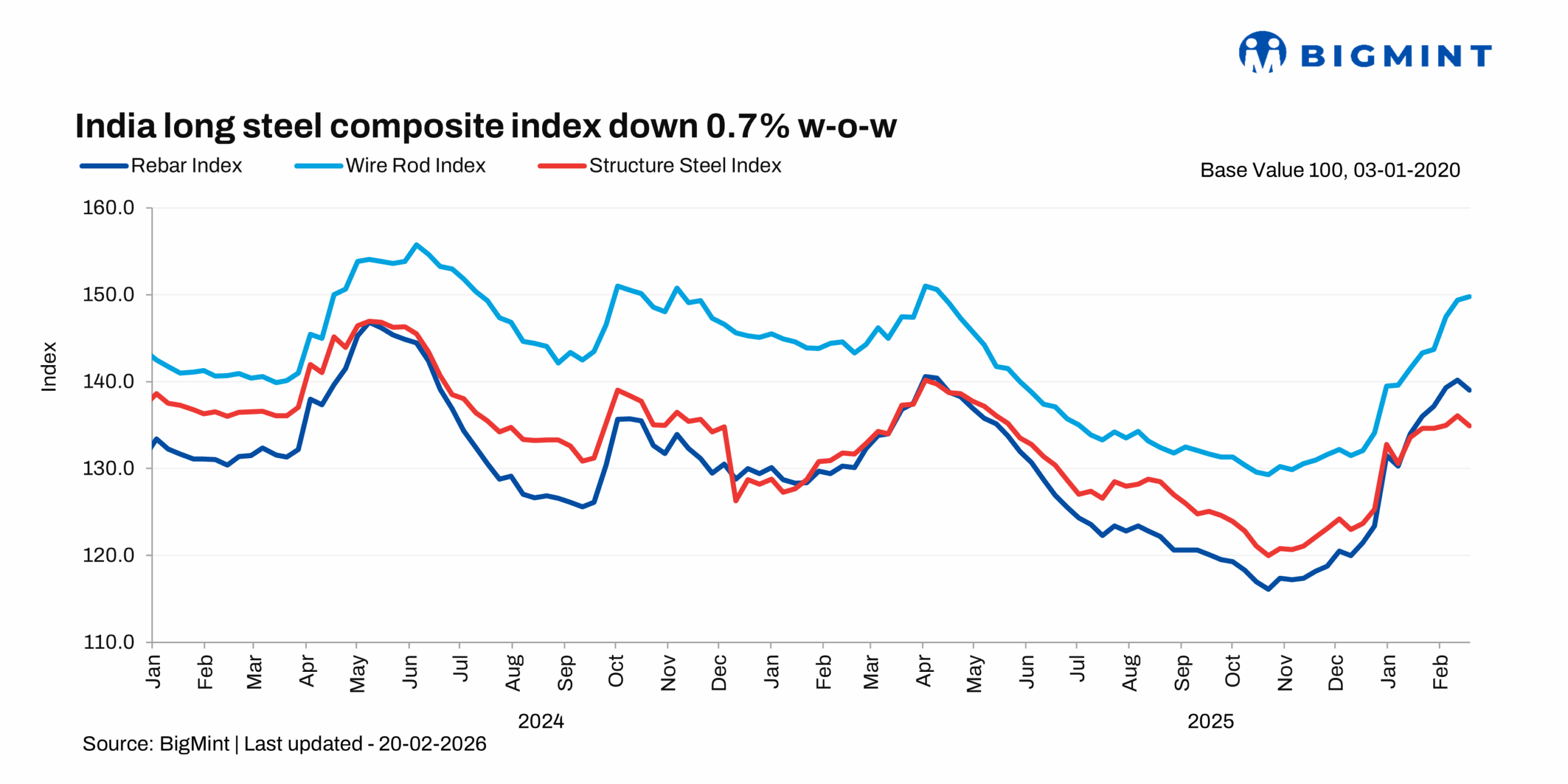 Morning Brief: After witnessing a sustained rally since the last week of December 2025, BigMint's India steel composite index, a barometer of the domestic market, edged down by 0.4% w-o-w, as assessed on 20 February. The index slipped as market sentiments turned conservative and cautious amid the continuous hike in prices and the inevitable softening in key raw materials prices, BigMint notes.