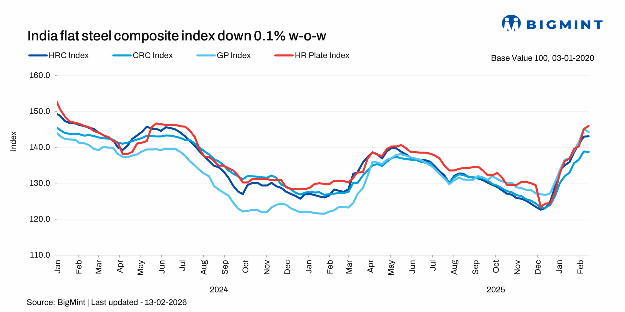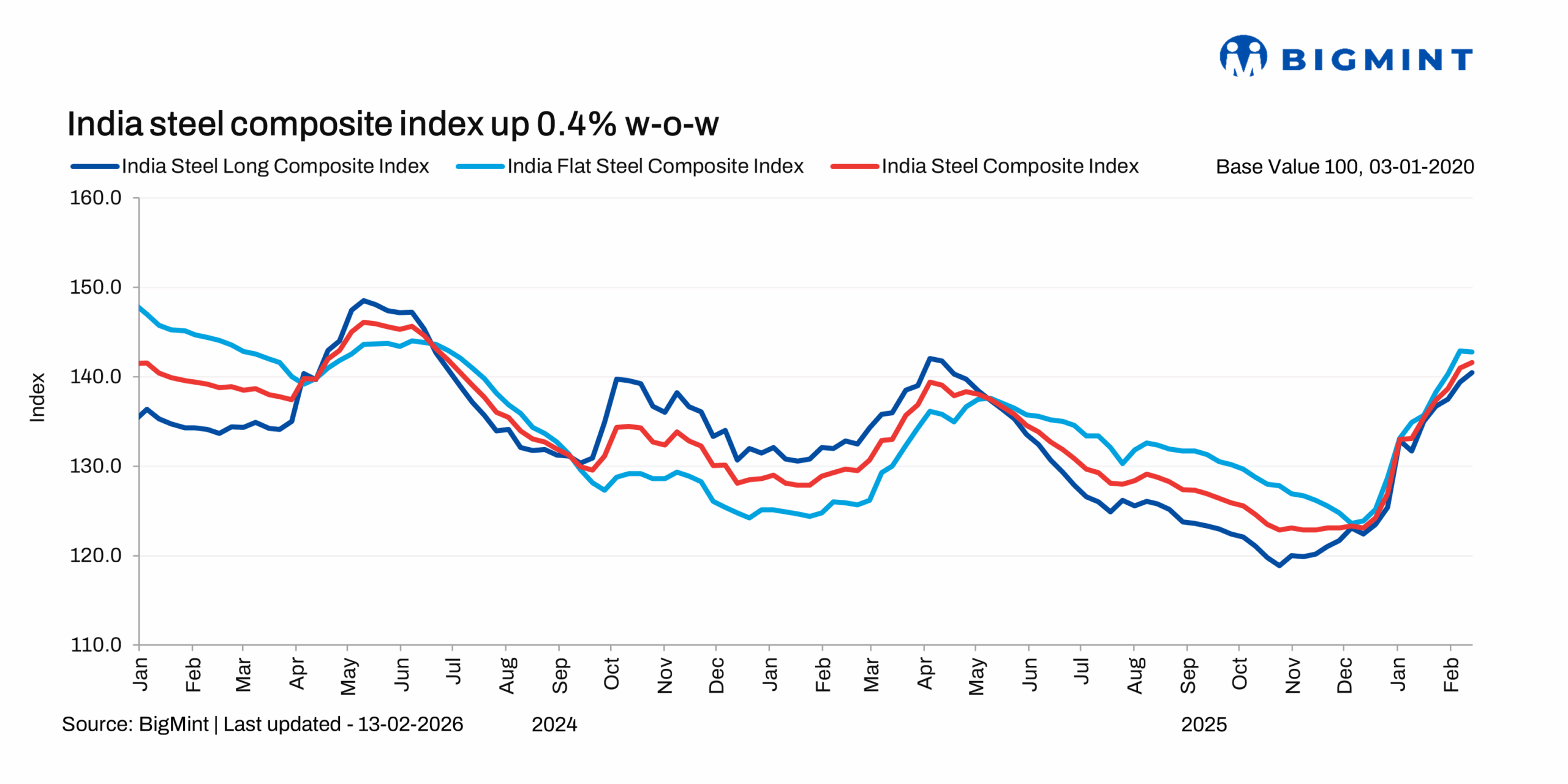 Morning Brief: Domestic steel prices trended higher, as assessed on the week ending 13 February 2026, with BigMint's composite steel index edging up 0.4% - at a rate far slower compared with the previous week as the market kept absorbing the sharp price hikes since early January, and trading sentiment turned cautious at higher price levels. However, the strength in the raw materials segment provided support to finished steel prices, BigMint notes.