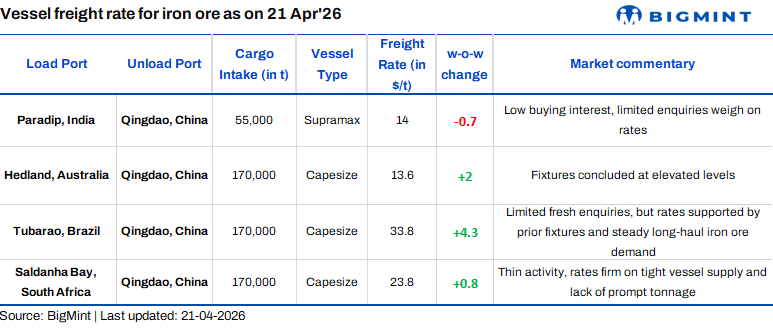 Iron ore freight markets exhibited diverse trends across key routes in the week ended 21 April. From India to China, Supramax rates on the Paradip-Qingdao route decline, sentiment remains weak, amid limited cargo activity and ample vessel availability.