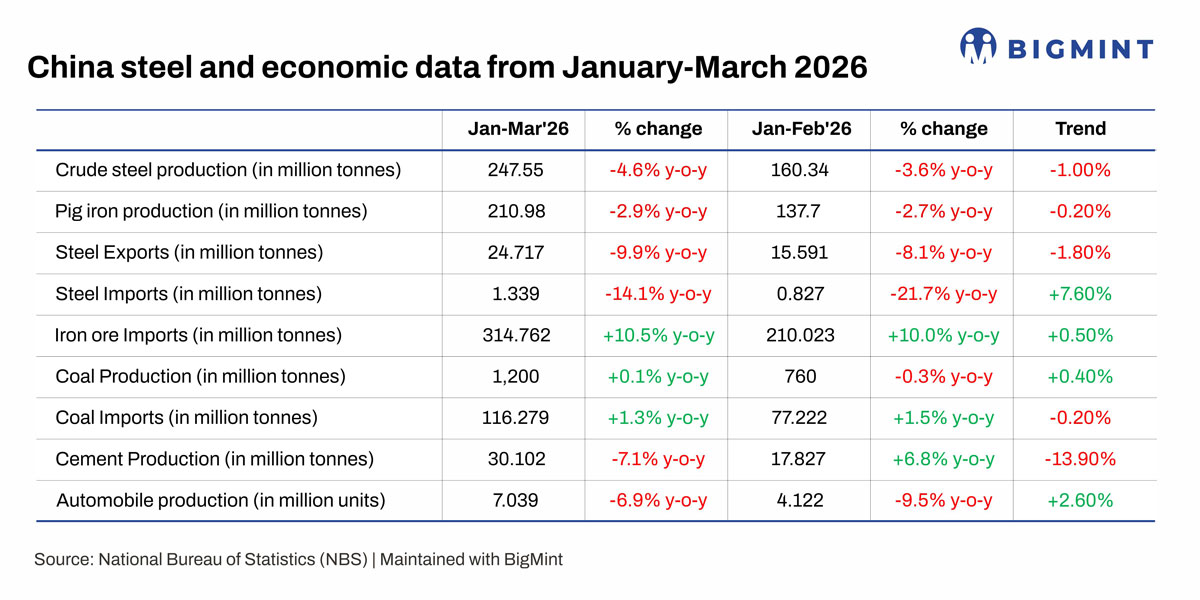 Iron ore imports surgeon improved supply: China's iron ore imports increased 10.5% y-o-y. Higher export volumes from key suppliers, particularly Australia, were a primary driver of increased imports, with there being fewer weather-related disruptions compared to last year, when cyclones had affected loading operations. BigMint data shows that Australia exported around 178 mnt of iron ore and pellets to China in January-March 2026 from 160 mnt a year earlier.