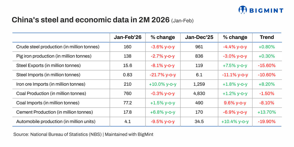 Steel exports retreat amid new licensing system: China's steel exports slowed down in January-February, as the reintroduction of export licensing requirements from January 2026 increased compliance costs and reduced the competitiveness of Chinese steel in international markets. A significant portion of earlier export growth had been driven by non-VAT trade, which has now been curtailed due to stricter regulatory oversight.