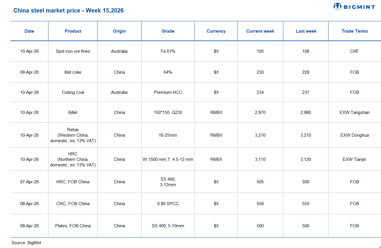 China's steel prices remained mixed in the week ended 10 April 2026, with domestic hot-rolled coil (HRC) prices decreasing w-o-w, while rebar prices remained stable. Raw materials, including iron ore, billet and coking coal prices declined, while met coke prices edged up w-o-w.