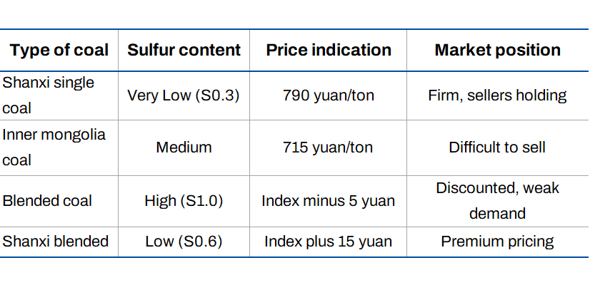 This is not a subtle difference. Price quotes for the same calorific value can vary widely based on quality. For example, a high-quality Shanxi coal with very low sulfur was offered at RMB 790/t. Meanwhile, a blended coal with higher sulfur content was offered at a discount to the index price. The market is clearly signaling that not all coal is equal.