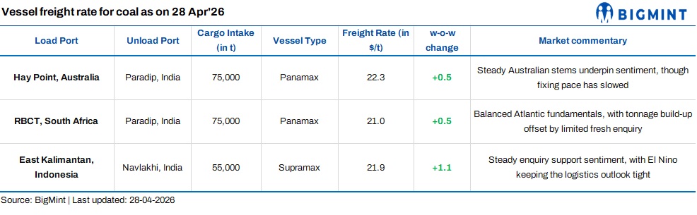 Dry bulk coal freights to India increased slightly w-o-w on 28 April, with firm Pacific fundamentals offsetting cautious buying, while Indonesian routes drew support from improving weather and a tightening logistics outlook.