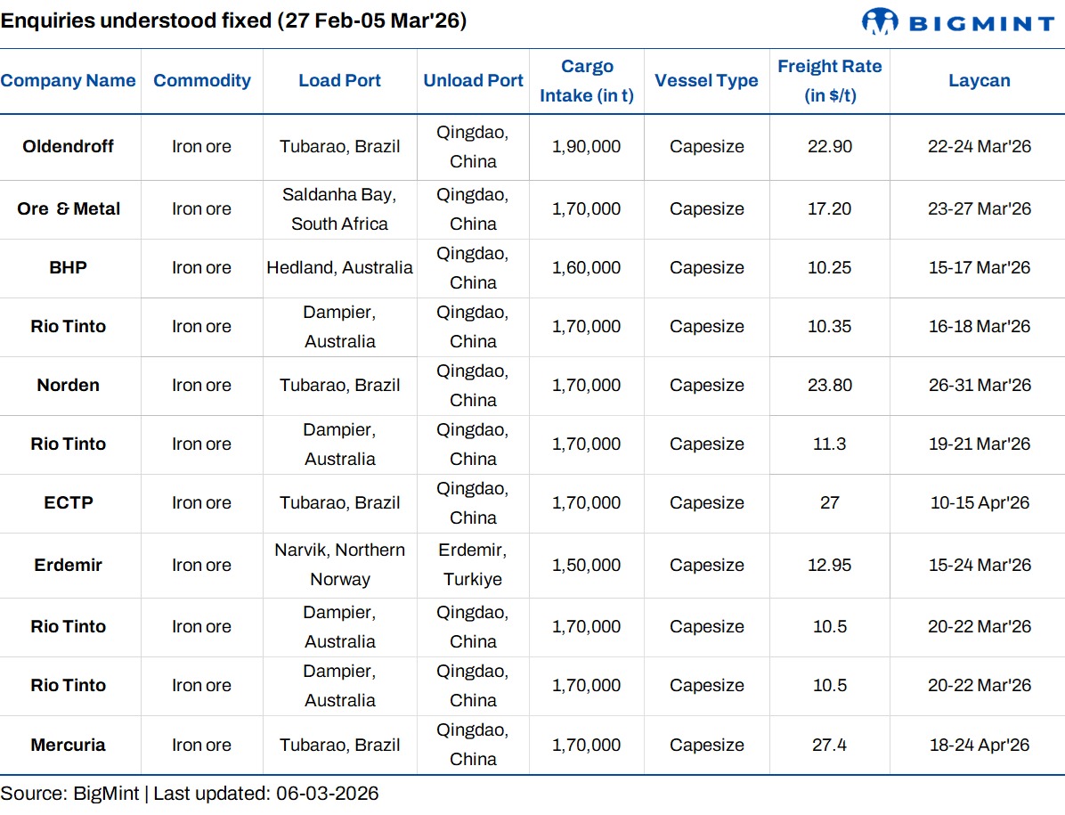 Freight rates are likely to remain firm, supported by elevated bunker prices and persistent geopolitical tensions in the Middle East, which continue to add risk premiums to shipping costs. However, the market direction will depend on the pace of iron ore cargo enquiries and developments in key shipping routes, particularly around the Persian Gulf and the Strait of Hormuz.