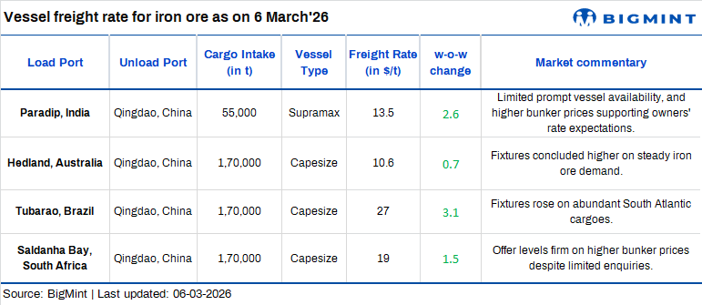 - Elevated bunker prices support iron ore freight rates: Rising bunker prices, driven by escalating Middle East tensions, have supported iron ore freight rates by increasing voyage costs for shipowners. With VLSFO approaching higher levels, the elevated fuel cost base is keeping freight rates firm despite moderate cargo enquiries. "Charterers remained cautious due to rising bunker costs and already elevated freight levels," a source mentioned.