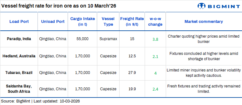 Dry bulk iron ore freights increased further w-o-w on 10 March 2026 following increased bunker rates and Brent crude oil futures, although trading activity remained relatively slow, with only a few fixtures concluded at higher levels. The market seems to be lacking clarity with limited firm quotes.