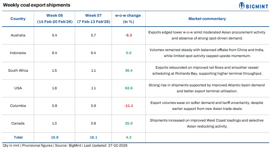 Global coal export shipments increased 4.3% w-o-w to 16.8 mnt in Week 08 (14 Feb-20 Feb'26), supported by a sharp recovery in Atlantic basin loadings, while Pacific volumes remained largely stable.