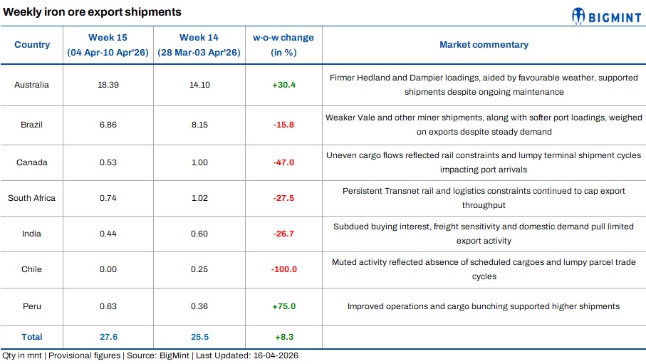 Global iron ore export shipments rose 8.3% w-o-w to 27.6 million tonnes (mnt) in the week ended 10 April, from 25.5 mnt a week earlier, according to BigMint data. Gains were driven by a sharp rebound in Australian shipments on improved port loadings and favourable weather. Brazil flows moderated, while Canada, South Africa and India remained constrained. Chile recorded no shipments, while Peru saw improved activity.
