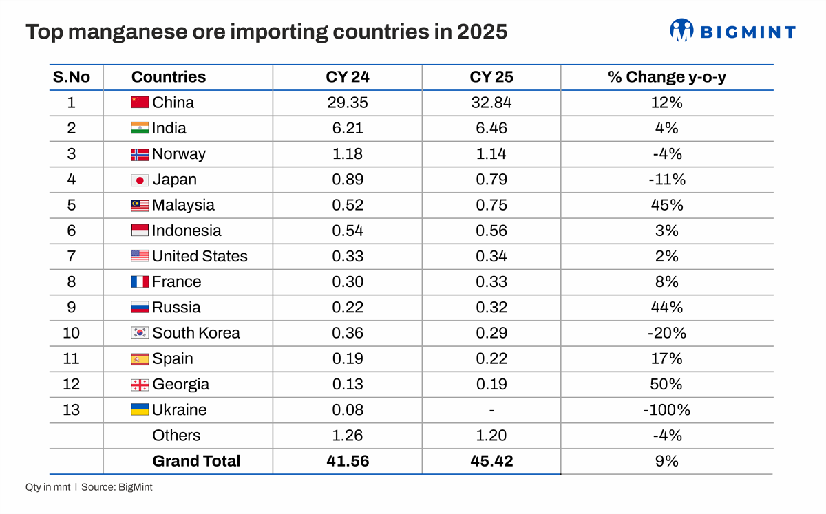 Global manganese ore imports increased from 41.5 million tonnes (mnt) in CY24 to 45.4 mnt in CY25, marking a rise of about 3.9 mnt y-o-y (10%). The growth was largely driven by stronger buying from key Asian markets, particularly China, India, and Malaysia. Factors such as front-loaded procurement, capacity expansions in alloy production, and improved supply availability from major exporters supported higher trade volumes, despite only moderate growth in global steel demand.