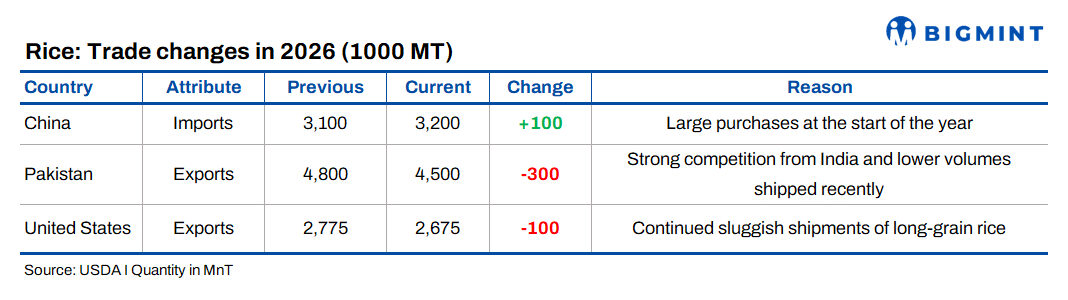 Global consumption has been revised downward, led by weaker demand across the Middle East and East Asia. While rice demand remains structurally resilient, short-term macroeconomic pressures and substitution effects are weighing on offtake.
