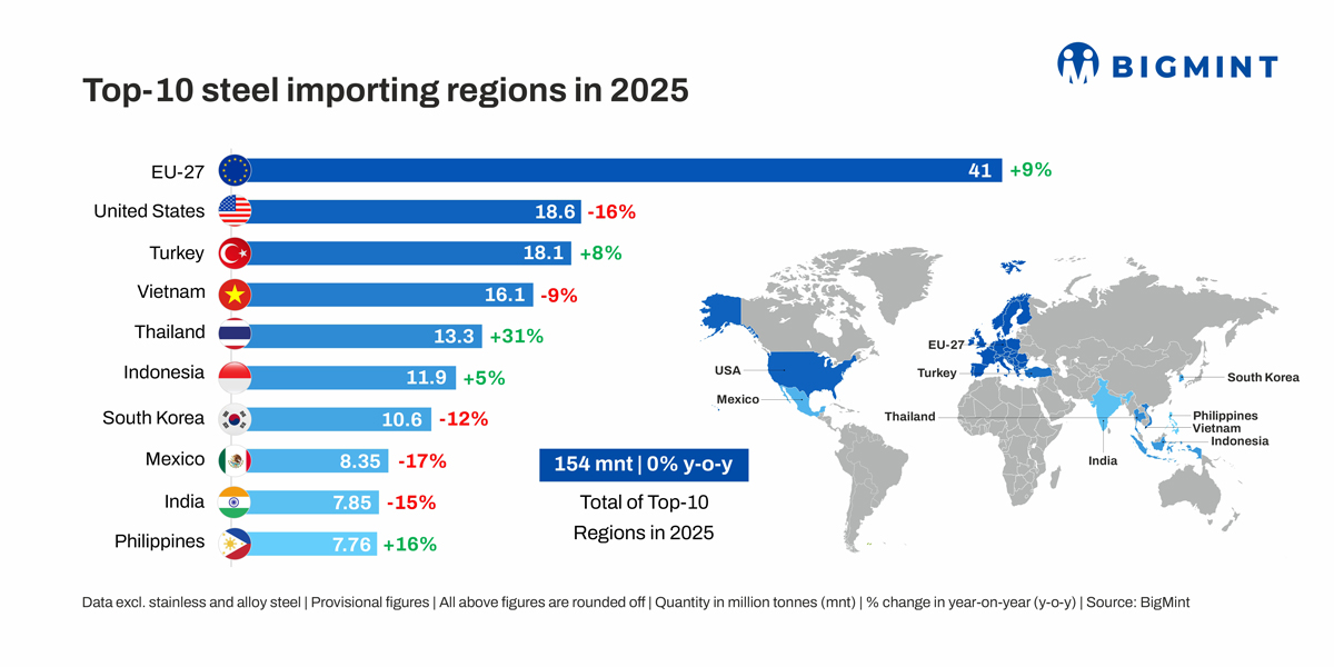 Morning Brief: The top 10 global steel exporting regions shipped 240 million tonnes (mnt) in CY'25 -- a modest 3% uptick from 232 mnt in CY'25, as per BigMint data (excluding alloy and stainless steel). China was the obvious growth driver with a 9% increase, while Turkiye, Russia, and Brazil also recorded double-digit hikes.