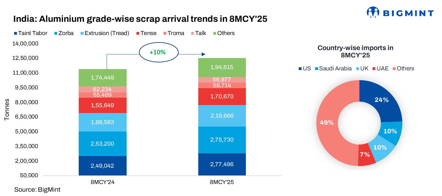 India's overall aluminium scrap imports increased by 10% to 1.25 mnt in 8MCY'25 from 1.13 mnt in 8MCY'24. Major importers also scaled up procurement amid a shortage of aluminium scrap during the initial months of the year, particularly following the imposition of US tariffs.
