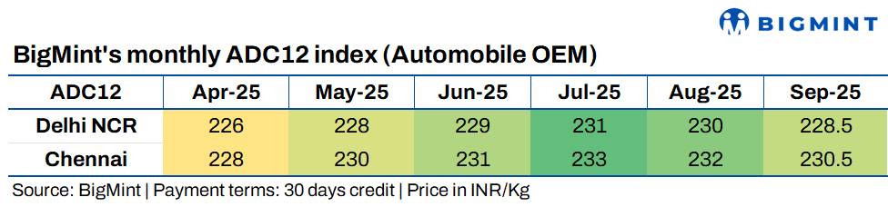 ADC12 prices are expected to stay range-bound between INR 227,000-230,000/t in both north and south India. A major price drop is unlikely due to steady festive demand. Additionally, the recent GST cut on passenger vehicles, effective from 22 September has triggered a surge in auto sales. With improved buying sentiment in the auto sector, ADC12 prices are likely to remain stable in the near term.